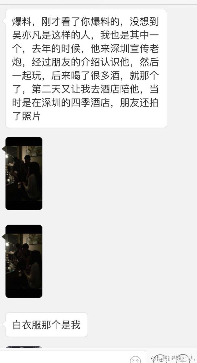 一名女子爆料去年吴亦凡在深圳宣传《老炮儿》,自己经朋友介绍认识,一起玩并喝了很多酒,第二天去酒店陪吴亦凡,曝光朋友拍下的照片。